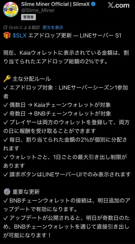 2025年10月8日待ちに待ったスライムマイナーのゲームトークン$SLXの上場&エアドロが開始されました。